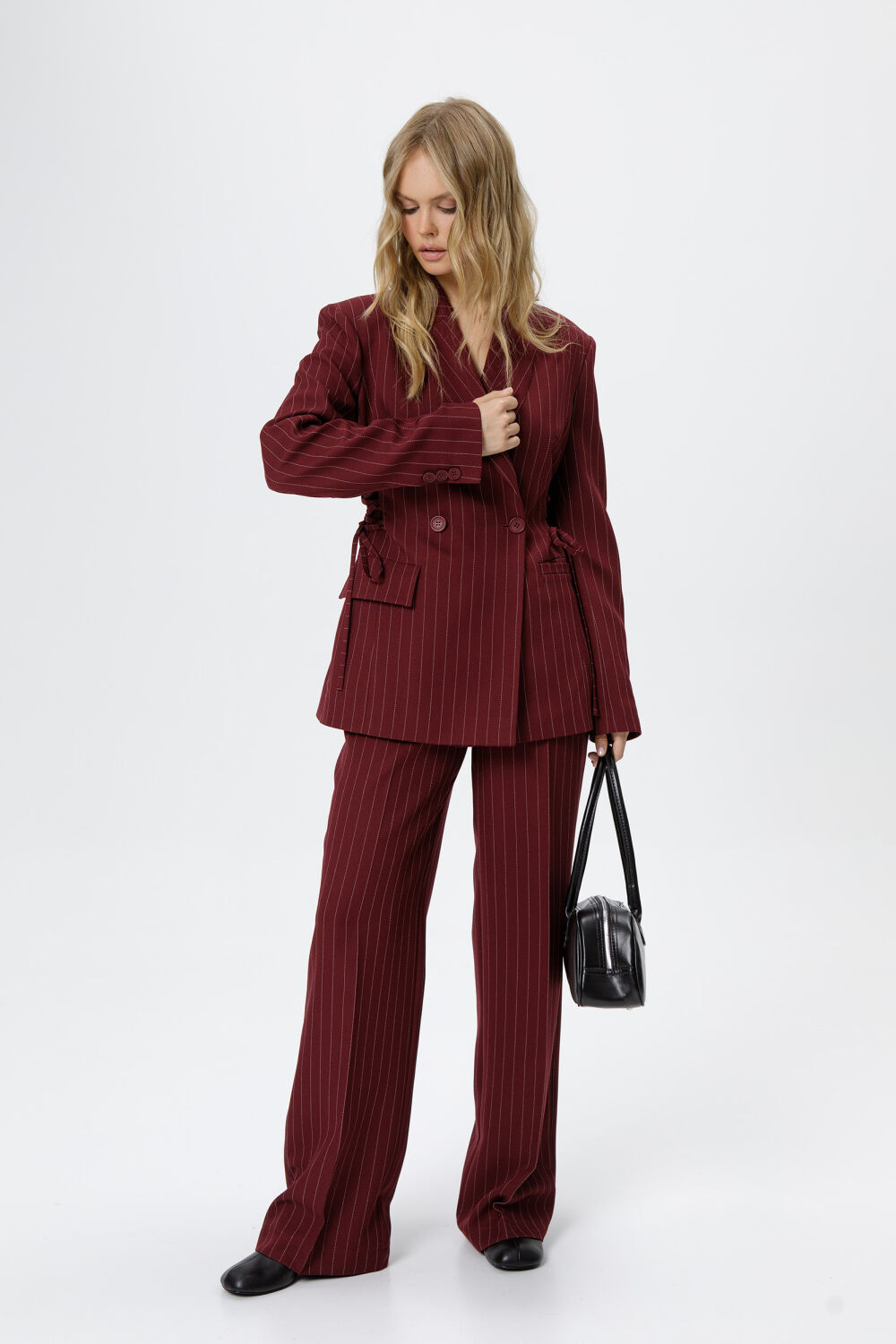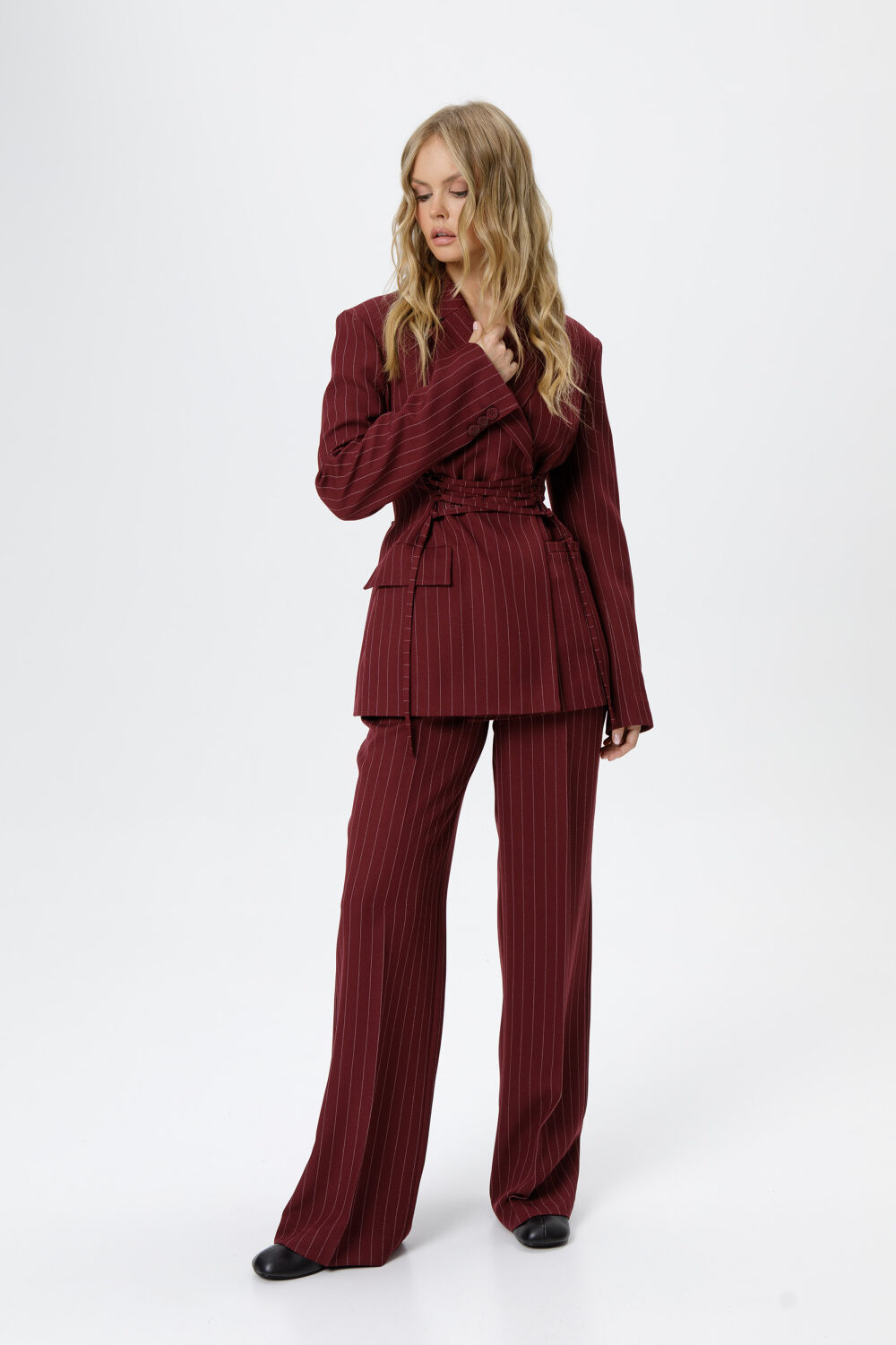 Детали: жакет полуприлегающего силуэта, расширенные плечи, рельефы, пиджачный воротник, застежка на две петли и пуговицы, функциональные карманы, жакет на подкладке. Жакет также можно зашнуровать по бокам.