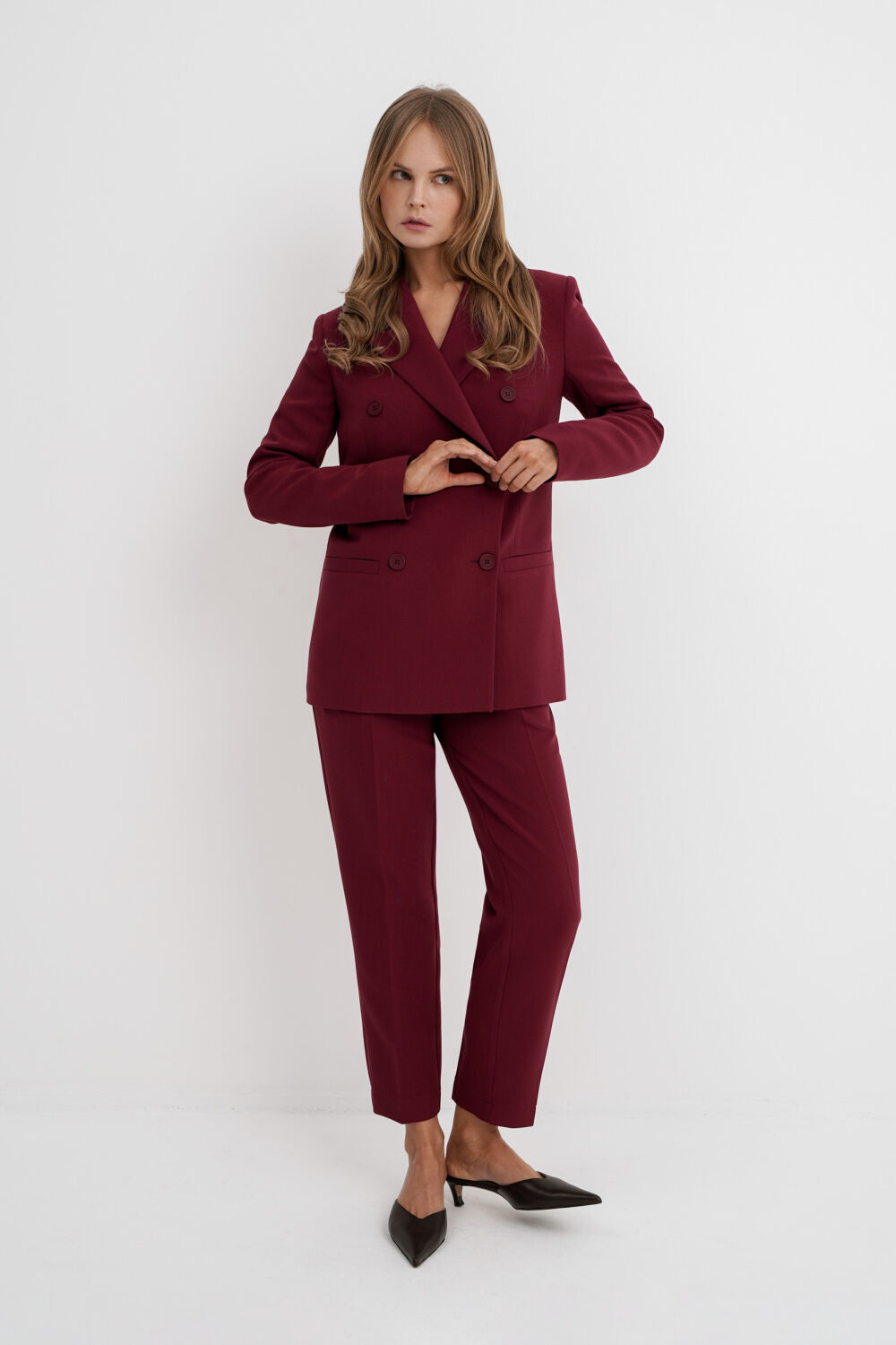Текстильный двубортный жакет с классической посадкой.