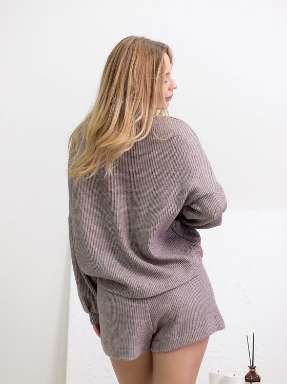 Женская пижама из вязаного полотна — уютный комплект, созданный для комфортного отдыха и стильных домашних образов. Верх выполнен со спущенной линией плеч, свободным силуэтом и небольшой планкой на пуговицах, что добавляет акцент и позволяет регулировать посадку по горловине. Рукава – объемные, на манжете, создают расслабленный и стильный силуэт. Шорты на эластичном поясе с декоративным шнуром обеспечивают удобную посадку и не сковывают движений. Мягкое вязаное полотно приятно к телу, хорошо дышит и дарит ощущение тепла и уюта.