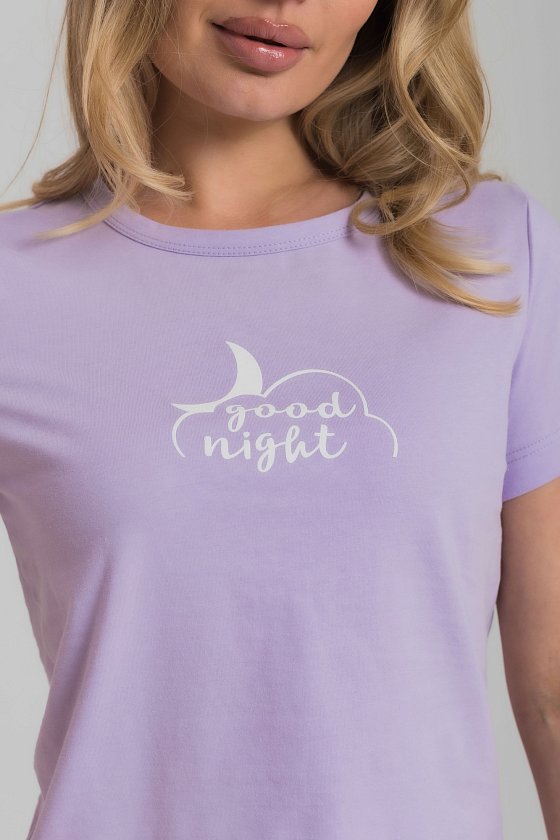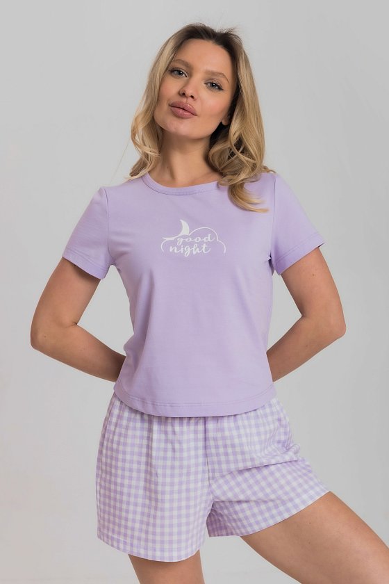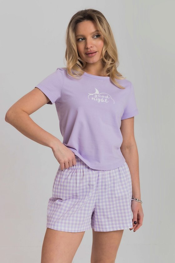 Женская пижама включает в себя футболку и шорты, выполненные из хлопкового полотна. Футболка прямого кроя с коротким рукавом и круглым вырезом горловины обеспечивает комфорт и свободу движений. Спереди на футболке нанесен принт. Шорты с поясом на широкой резинке, обеспечивают идеальную посадку и удобство. Такой дизайн позволяет свободно двигаться и чувствовать себя комфортно даже во время сна.