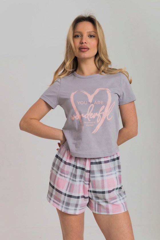 Женская пижама включает в себя футболку и шорты, выполненные из хлопкового полотна. Футболка прямого кроя с коротким рукавом и круглым вырезом горловины обеспечивает комфорт и свободу движений. Спереди на футболке нанесен принт. Шорты с поясом на широкой резинке, обеспечивают идеальную посадку и удобство. Такой дизайн позволяет свободно двигаться и чувствовать себя комфортно даже во время сна.