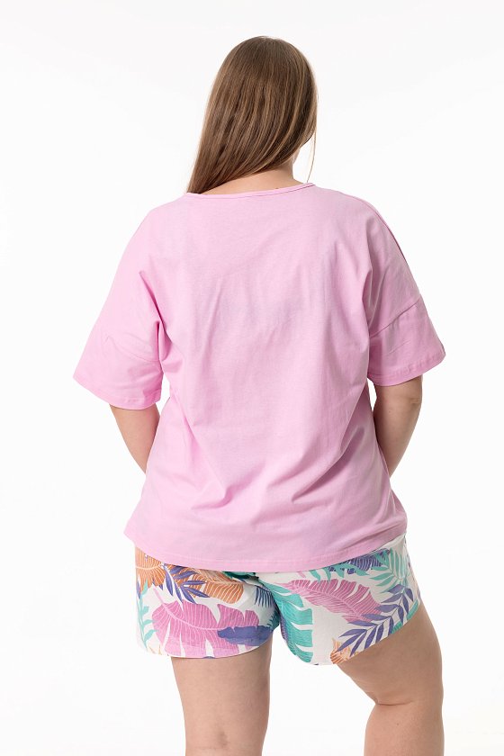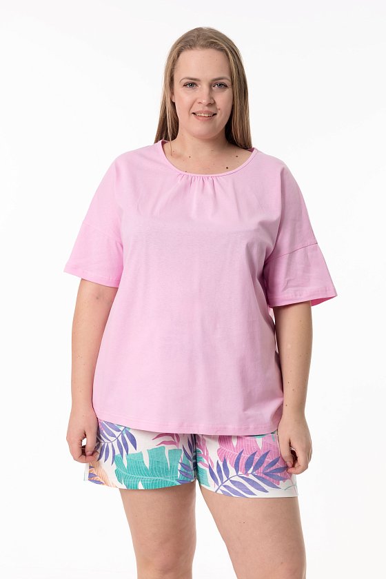Пижама выполненная из кулирки и состоящая из шорт и футболки — комфортный и женственный комплект для сна и домашнего отдыха. Футболка из однотонной кулирки с коротким спущенным рукавом и декоративной сборкой по горловине имеет длину примерно до линии бедер. Шорты средней длины из набивной кулирки прямого кроя с притачным поясом и боковыми карманами на поясе обеспечивают удобство и завершенный внешний вид модели.
