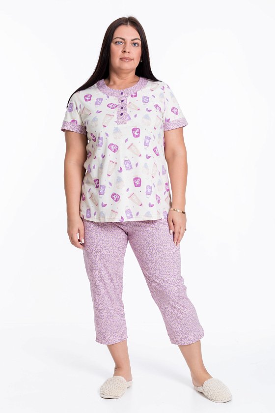 Пижама из кулирки, 100% хлопок, состоит из футболки с коротким рукавом на манжете и капри. Спереди фигурная планка с застёжкой на пуговицы. Капри с поясом на резине, внизу по бокам небольшие разрезы.