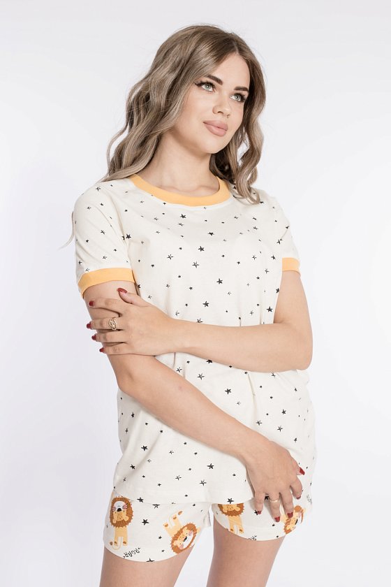 Пижама выполнена из кулирки с набивным рисунком. Футболка с коротким рукавом, с планкой из рибаны по горловине и низу рукавов. Шорты короткие, пояс на резине.