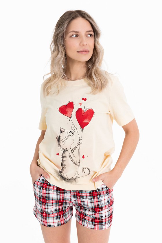 Пижама выполнена из хлопкового полотна. Футболка однотонная, с коротким втачным рукавом и планкой по горловине. Спереди нанесён принт. Шорты с боковыми карманами и притачным поясом на резинке.