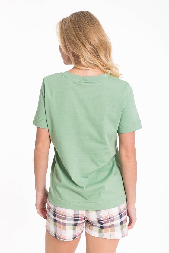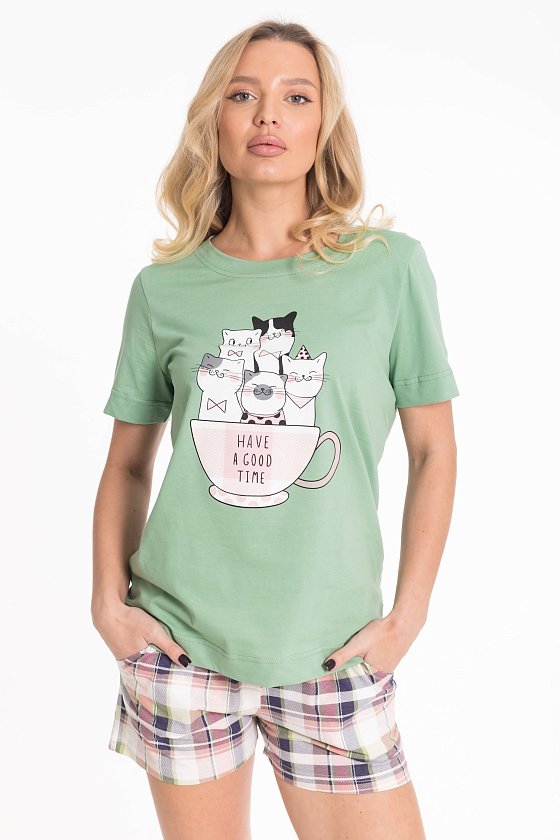 Женская пижама — отличный выбор для комфортного сна или отдыха. Она состоит из футболки и шорт, выполненных из мягкого и приятного к телу хлопкового полотна. Футболка с коротким втачным рукавов и планкой по горловине. На передней части футболки нанесён принт, который добавляет яркости и оригинальности. Шорты короткие, с боковыми карманами и притачным поясом на резинке. Они обеспечивают свободу движений и комфорт во время сна. Такая пижама идеально подойдёт для домашнего отдыха или сна. Она выполнена из качественного материала, который обеспечивает хорошую воздухопроницаемость.