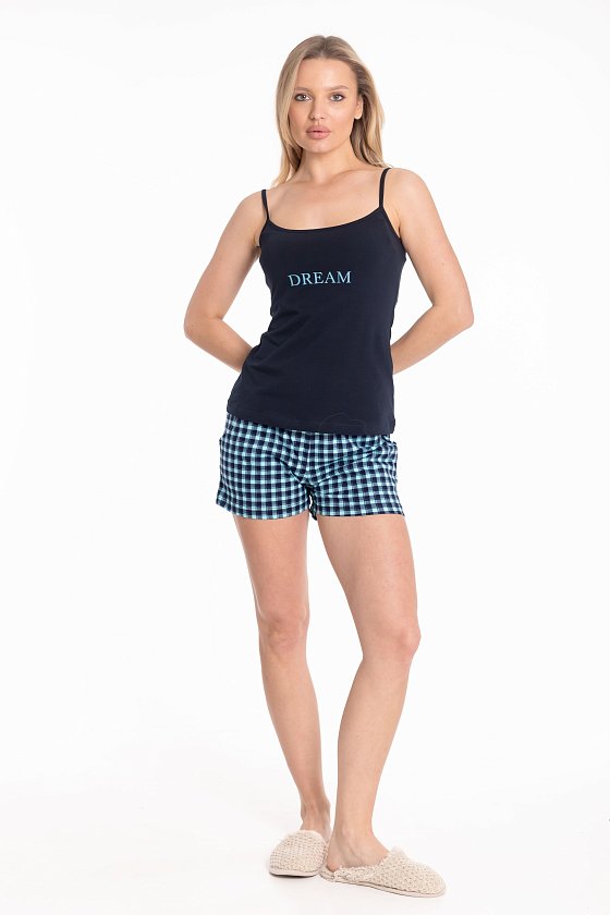 Женский комплект состоит из топа и шорт. Топ однотонный с принтом спереди, на тонких бретелях. Топ выполнен из кулирки с лайкрой. Шорты из кулирки с набивным рисунком, пояс на резине, по бокам с карманами.
