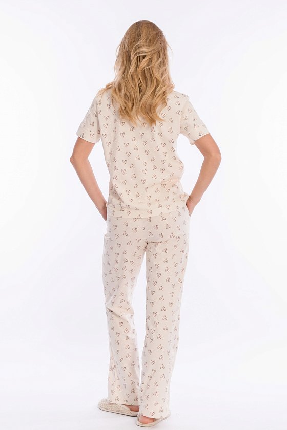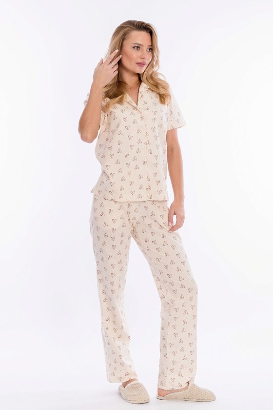 Женская пижама выполнена из кулирки, 100% хлопок. Рубашка с отложным воротником, коротким рукавом и застёжкой на пуговицы спереди. Брюки с боковыми карманами и притачным поясом на резине.