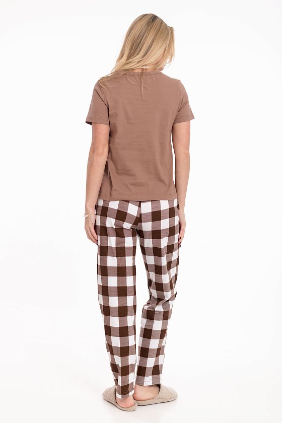 Женская пижама из хлопкового полотна представляет собой стильный и удобный вариант для повседневного использования. Футболка однотонная, с коротким втачным рукавом и планкой по горловине. Спереди нанесен принт, который добавляет изюминку и индивидуальность вашему образу. Брюки из полотна с набивным рисунком прямого кроя и пояс на резинке, обеспечивают удобную посадку и комфорт в движении. По бокам размещены карманы, что добавляет функциональность и практичность этому комплекту.