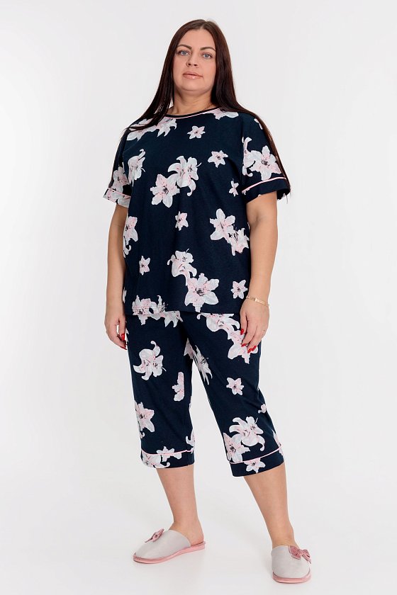 Пижама выполнена из х/б полотна с набивным рисунком. Футболка со спущенным рукавом и круглым вырезом горловины, снизу в боковых швах декоративные разрезы. Капри с поясом на резине и карманами по бокам. Пижама декорирована кантом.