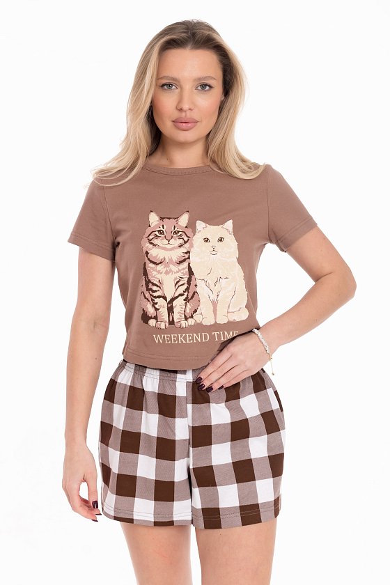 Пижама выполнена из кулирки, 100% хлопок, состоит из шорт с высокой посадкой и укороченной футболки. Футболка с принтом спереди и круглым вырезом горловины, оформленным бейкой. Пояс шорт на резине.