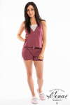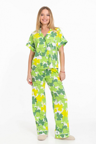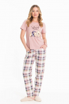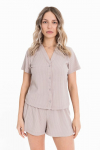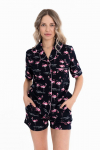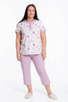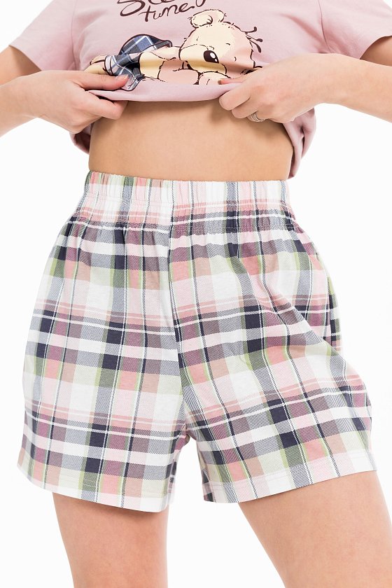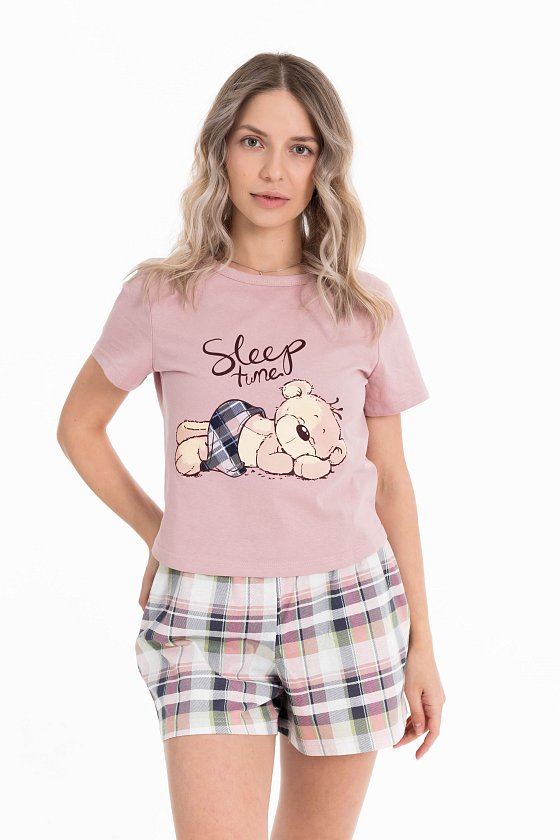 Пижама выполнена из кулирки, 100% хлопок, состоит из шорт с высокой посадкой и укороченной футболки. Футболка с принтом спереди и круглым вырезом горловины, оформленным бейкой. Пояс шорт на резине.