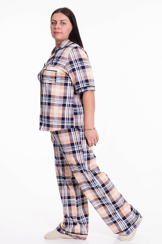 Женская пижама выполнена из кулирки, 100% хлопок. Рубашка с отложным воротником, коротким рукавом и карманом спереди. Рубашка застёгивается на пуговицы. Брюки свободные, с притачным поясом на резине. Рубашка и брюки украшены декоративным элементом - кантом.