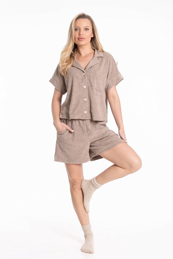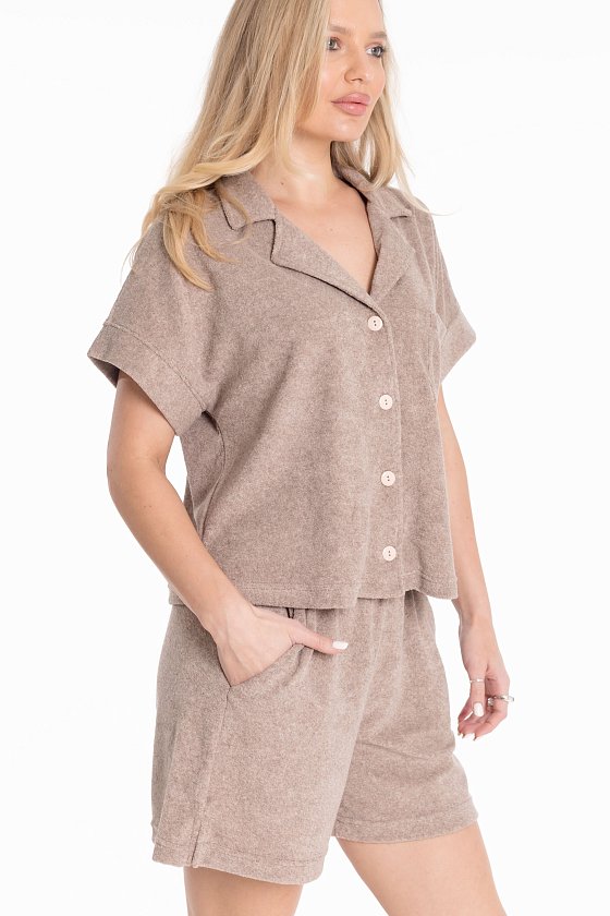 Женская пижама из однотонной махры — отличный выбор для повседневной носки. Рубашка свободного силуэта с цельнокроеным коротким рукавом и застёжкой на пуговицах обеспечивает свободу движений. Отложной воротник, боковые разрезы и накладной карман на полочке придают изделию оригинальность. Шорты с боковыми карманами и поясом на резинке обеспечивают комфортную посадку и не сковывают движения. Разрезы по бокам внизу также обеспечивают комфорт при носке. Изготовленная из натуральной ткани, пижама обеспечит комфорт в течение всего дня.