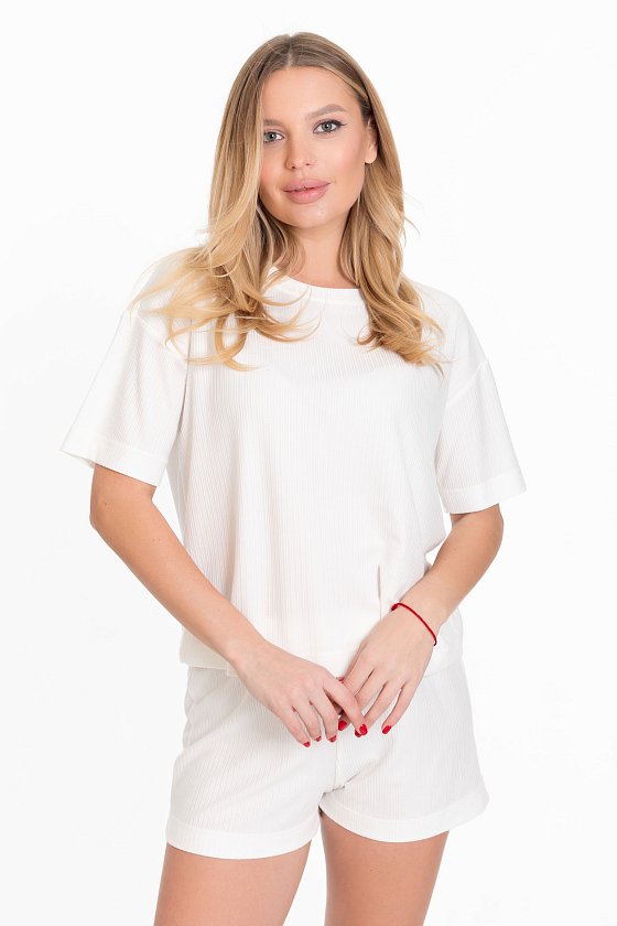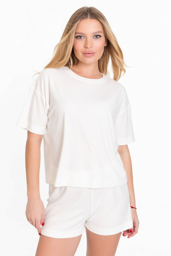 Женская пижама включает в себя футболку и шорты, выполненные из интерлока ринг-вискон в нежном молочном цвете. Футболка прямого кроя с спущенным коротким рукавом и круглым вырезом горловины обеспечивает комфорт и свободу движений. Мягкое и приятное на ощупь полотно интерлок ринг-вискон будет нежно ложиться на тело, создавая ощущение комфорта и уюта. Шорты короткие, с поясом на широкой резинке, обеспечивают идеальную посадку и удобство. Такой дизайн позволяет свободно двигаться и чувствовать себя комфортно даже во время сна. Молочный цвет - нейтральный и элегантный, идеально подходит для пижамы, создавая атмосферу спокойствия и уюта.