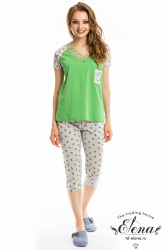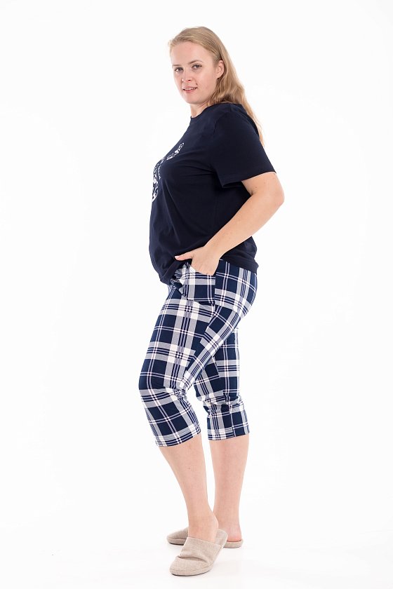 Женская пижама — отличный выбор для комфортного сна и отдыха. Пижама состоит из футболки и капри, выполненных из мягкого хлопкового полотна. Футболка однотонная, с коротким рукавом и принтом спереди. Капри из кулирки с набивным рисунком, с боковыми карманами и поясом на резинке, что обеспечивает свободу движений и комфортную посадку.