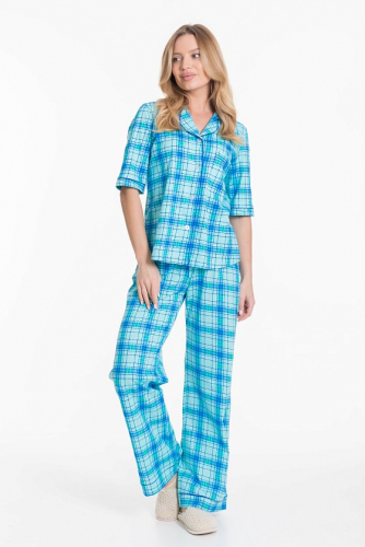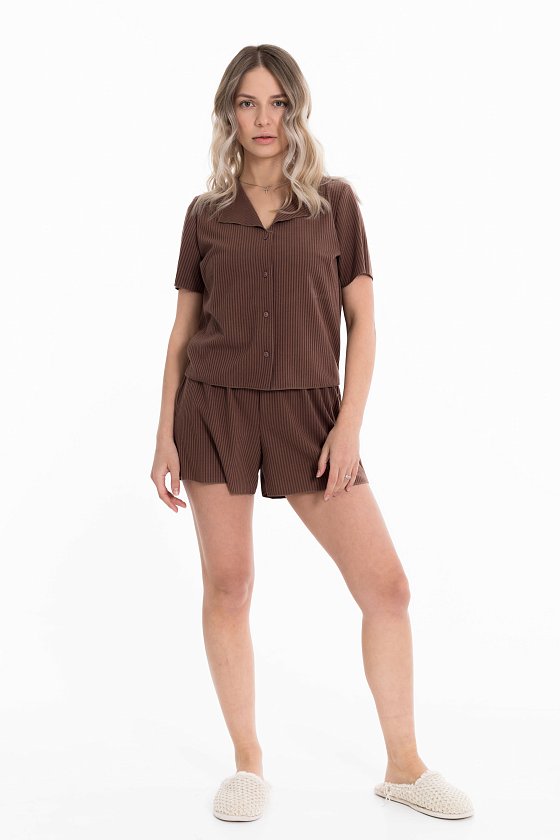 Пижама выполнена из кашкорсе с добавлением вискозы. Рубашка с коротким рукавом и застежкой на пуговицы спереди. Шорты свободные, с поясом на резине.