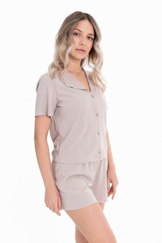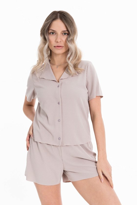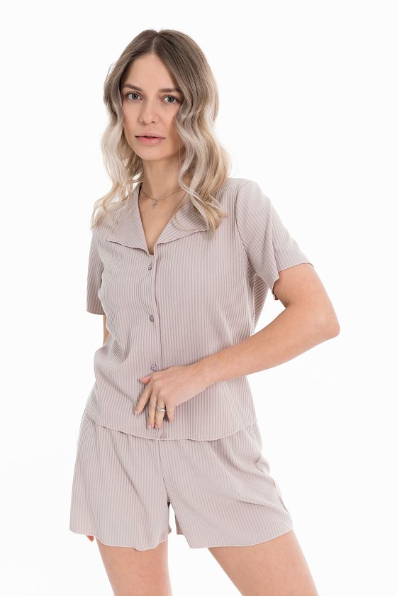 Пижама выполнена из кашкорсе с добавлением вискозы. Рубашка с коротким рукавом и застежкой на пуговицы спереди. Шорты свободные, с поясом на резине.