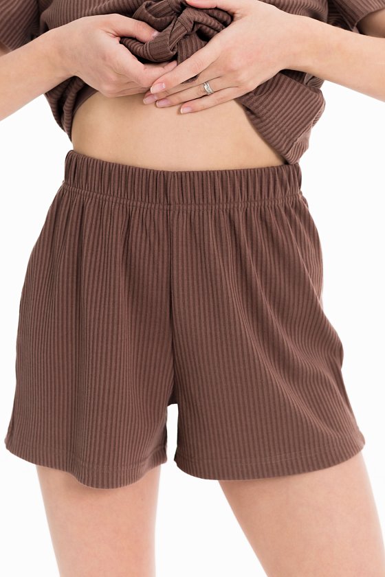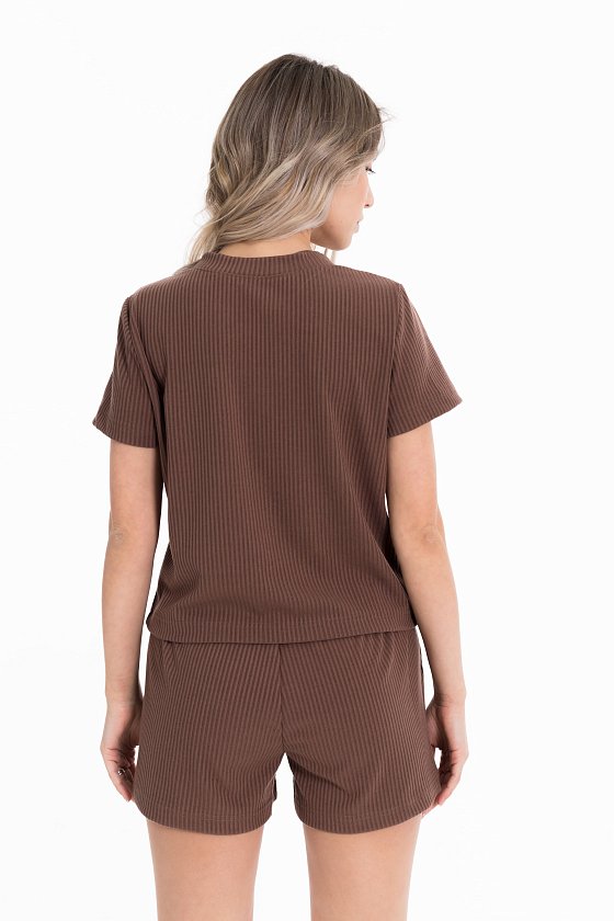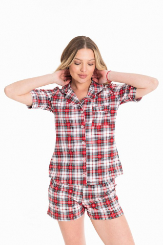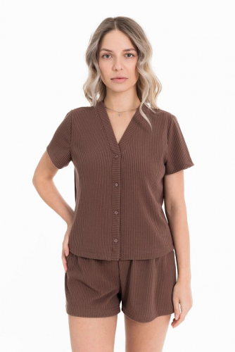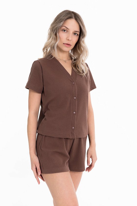 Пижама выполнена из кашкорсе с добавлением вискозы. Рубашка с коротким рукавом и застежкой на пуговицы спереди. Шорты свободные, с поясом на резине.