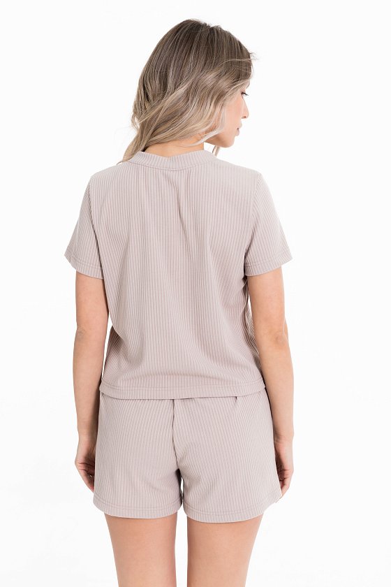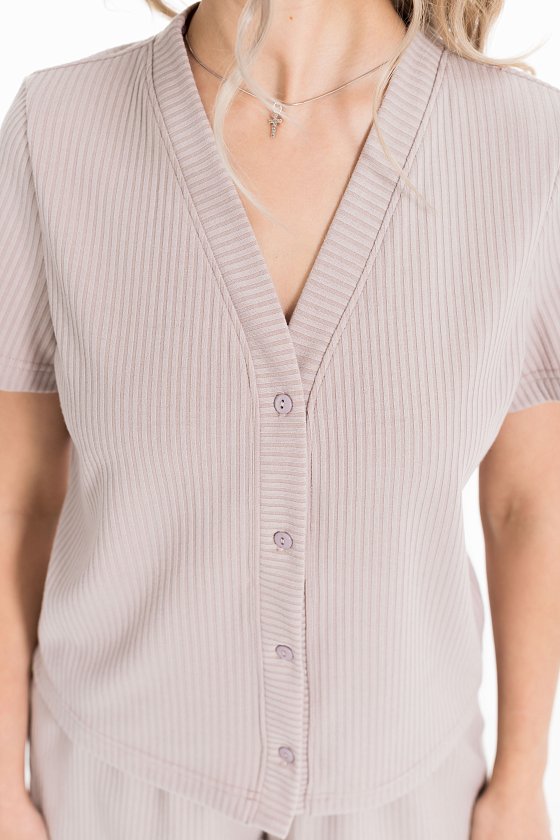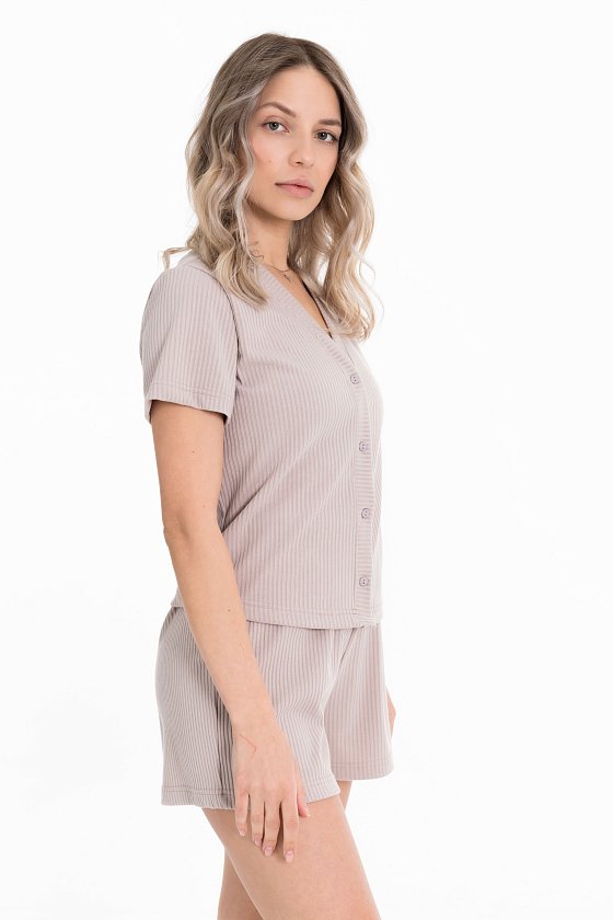 Пижама выполнена из кашкорсе с добавлением вискозы. Рубашка с коротким рукавом и застежкой на пуговицы спереди. Шорты свободные, с поясом на резине.