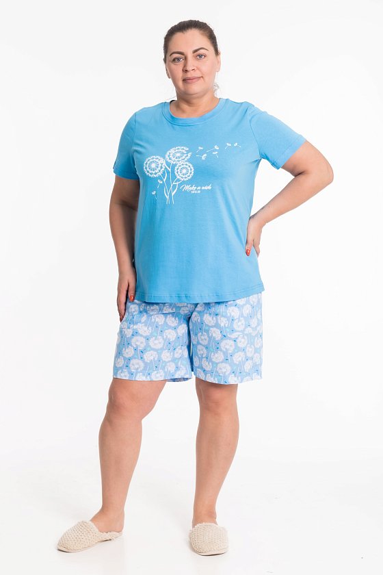 Женская пижама включает в себя футболку и шорты, выполненные из хлопкового полотна. Футболка прямого кроя с принтом, коротким рукавом и круглым вырезом горловины обеспечивает комфорт и свободу движений. Шорты с поясом на широкой резинке, обеспечивают идеальную посадку и удобство. Такой дизайн позволяет свободно двигаться и чувствовать себя комфортно даже во время сна.