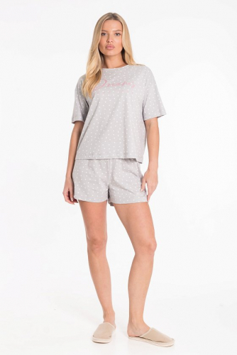 Пижама женская выполнена из хлопкового полотна, что обеспечивает комфорт и удобство в носке. Комплект состоит из однотонной футболки и капри. Футболка с коротким втачным рукавом и круглым вырезом горловины, оформленным притачной планкой, дополнена стильным принтом спереди. Капри имеют боковые карманы и удобный пояс на резинке. Такой комплект отлично подойдёт для сна и домашнего отдыха.