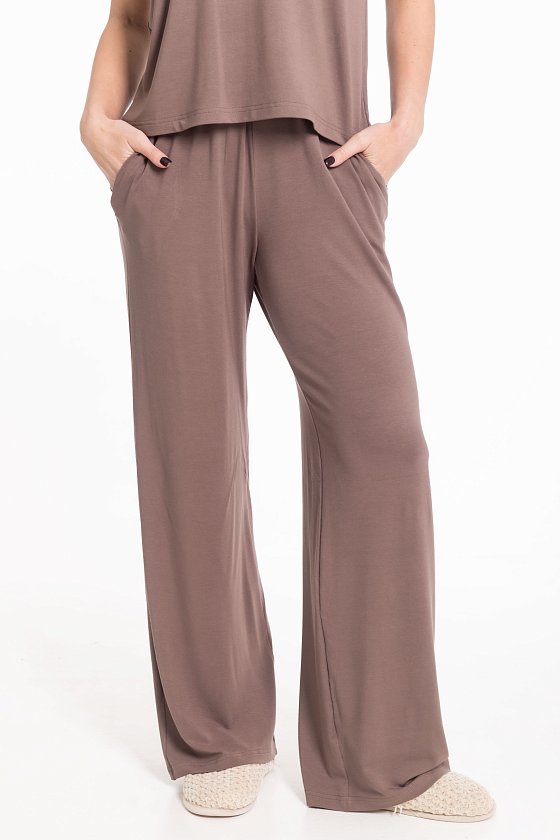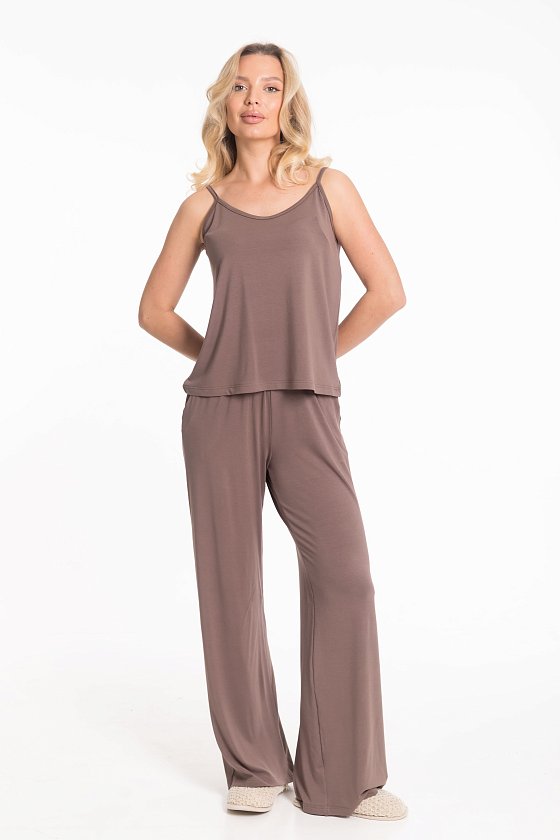Пижама из мягкой однотонной вискозы состоит из топа на бретелях и брюк. Топ с регулируемыми по длине бретелями позволяет настроить посадку по фигуре. Брюки выполнены с удобным поясом на резинке и боковыми карманами, что обеспечивает комфорт при носке. Лёгкое вискозное полотно приятно к телу и идеально подходит для сна и домашнего отдыха.