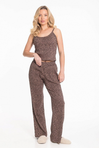 Женская пижама из мягкого кашкорсе с набивным рисунком состоит из брюк и майки на бретелях. Брюки выполнены с притачным поясом и удобными боковыми карманами. Майка прилегающего к телу силуэта и длиной чуть ниже талии, что обеспечивает комфорт и свободу движений во время отдыха.