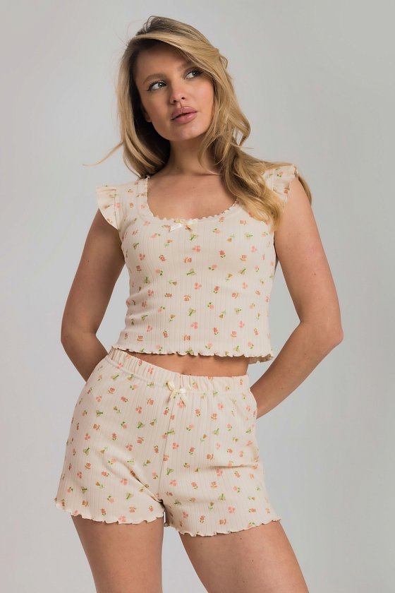 Пижама из мягкого и приятного к телу интерлока состоит из топа и шорт. Топ оформлен милыми "крылышками" по проймам и аккуратной отделкой горловины. Шорты на удобной резинке, без карманов. Пижама декорирована бантиками и отделкой на микрооверлоке, придающей образу нежность и изящность.