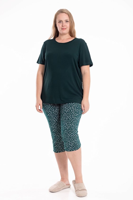Женская пижама выполнена из комбинации хлопкового полотна и нежной вискозы. Комплект состоит из однотонной футболки с коротким втачным рукавом и капри. Футболка из вискозы, оформлена аккуратной притачной планкой по горловине. Капри из кулирки с поясом на удобной резинке и дополнены практичными боковыми карманами. Идеальный комплект для комфортного отдыха.