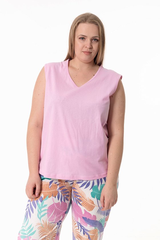 Пижама выполненная из кулирки станет комфортным вариантом для сна и домашнего отдыха. Комплект состоит из однотонной майки и брюк с набивным рисунком. Брюки прямого силуэта среднего объёма оснащены притачным поясом и боковыми карманами, обеспечивая удобную посадку и свободу движений. Майка прямого кроя с V-образным вырезом горловины имеет длину примерно до линии бёдер, создавая лёгкий и аккуратный силуэт.