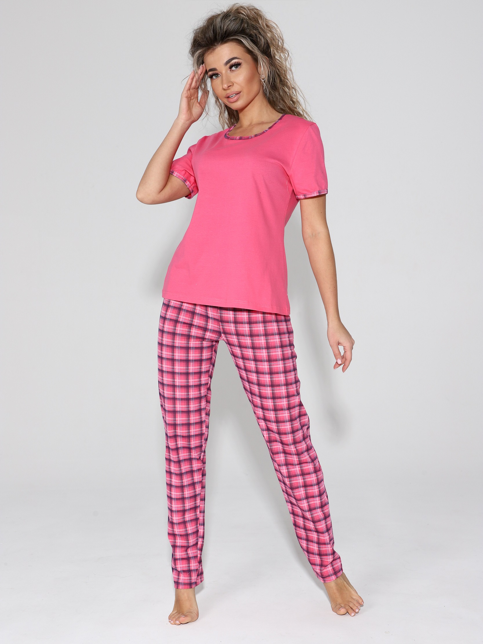 Пижама изготовлена из ткани – кулирка, состоящая из 100% хлопка. Ткань приятна и удобна в носке, она хорошо пропускает воздух и поддерживает оптимальную температуру (в ней не жарко и не холодно). Не требовательна в уходе.