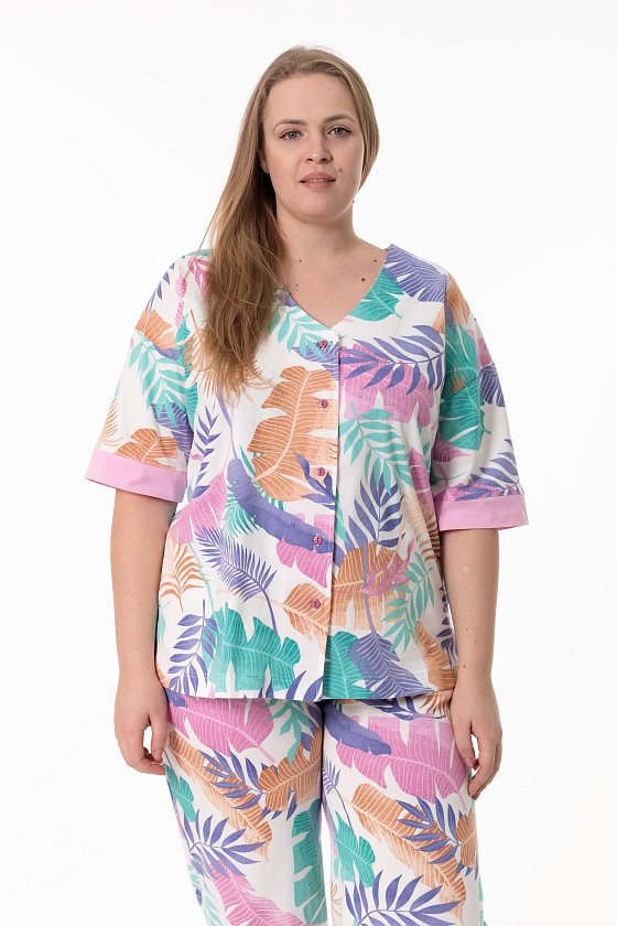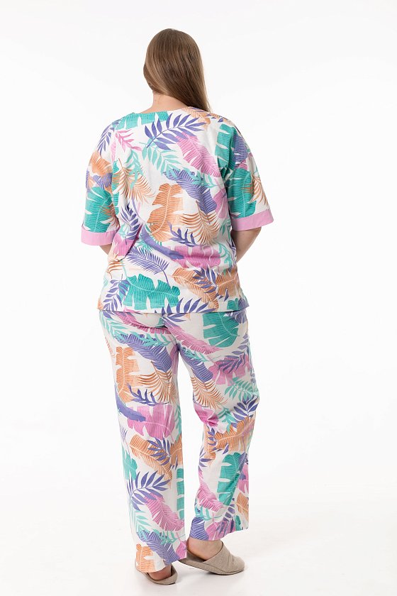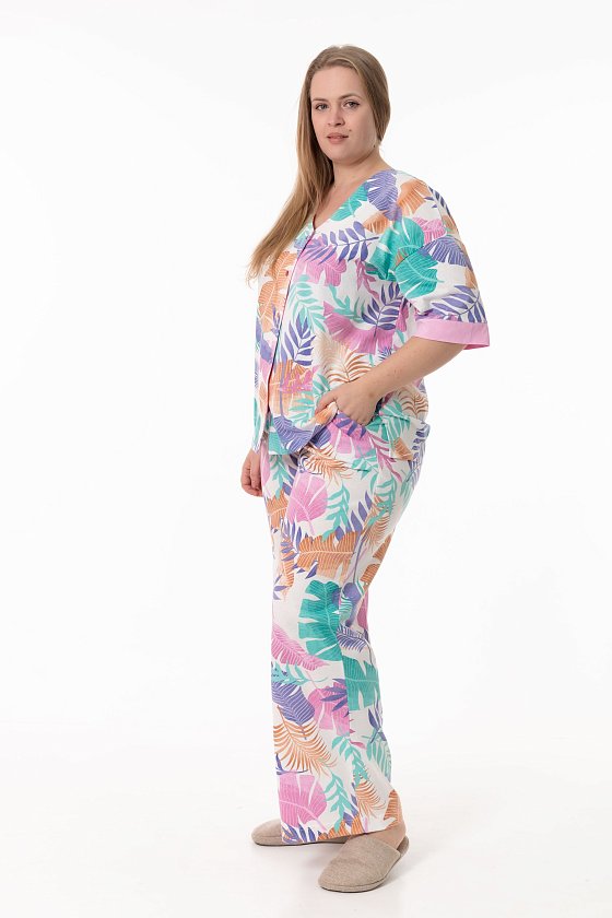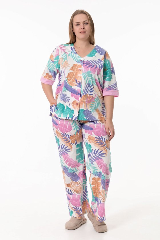 Пижама выполненная из кулирки и состоящая из рубашки и брюк - комфортный и свободный комплект для сна и домашнего отдыха. Брюки прямого кроя имеют свободную посадку, притачной пояс и боковые карманы, обеспечивают удобство в носке. Рубашка оверсайз со спущенным рукавом длиной примерно до линии локтя застёгивается на пуговицы и имеет V-образный вырез горловины. В боковых швах предусмотрены разрезы, а планка рукавов, подборта и обтачка спинки выполнены из однотонного отделочного материала, создавая аккуратный контраст и завершённый внешний вид модели.