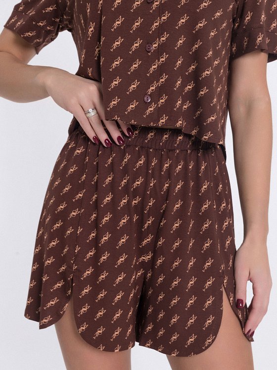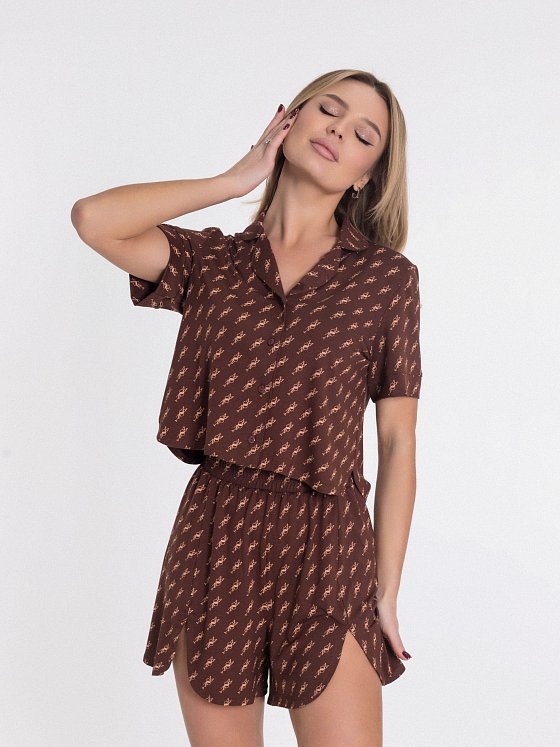 Женская пижама из лёгкой вискозы с набивным рисунком — стильный комплект для комфортного отдыха. Укороченная рубашка свободного силуэта выполнена с коротким рукавом, отложным воротником и застёжкой на пуговицы. По бокам — аккуратные закругления, придающие модели лёгкость и женственный акцент. Шорты свободного кроя с удобным поясом на резинке. Спереди и по бокам выполнены фигурные разрезы с плавными закруглениями, которые красиво подчёркивают линию ног и добавляют динамики силуэту. Вискозное полотно мягко ложится по телу, хорошо дышит и дарит ощущение лёгкости — идеальный комплект для сна и домашнего отдыха.