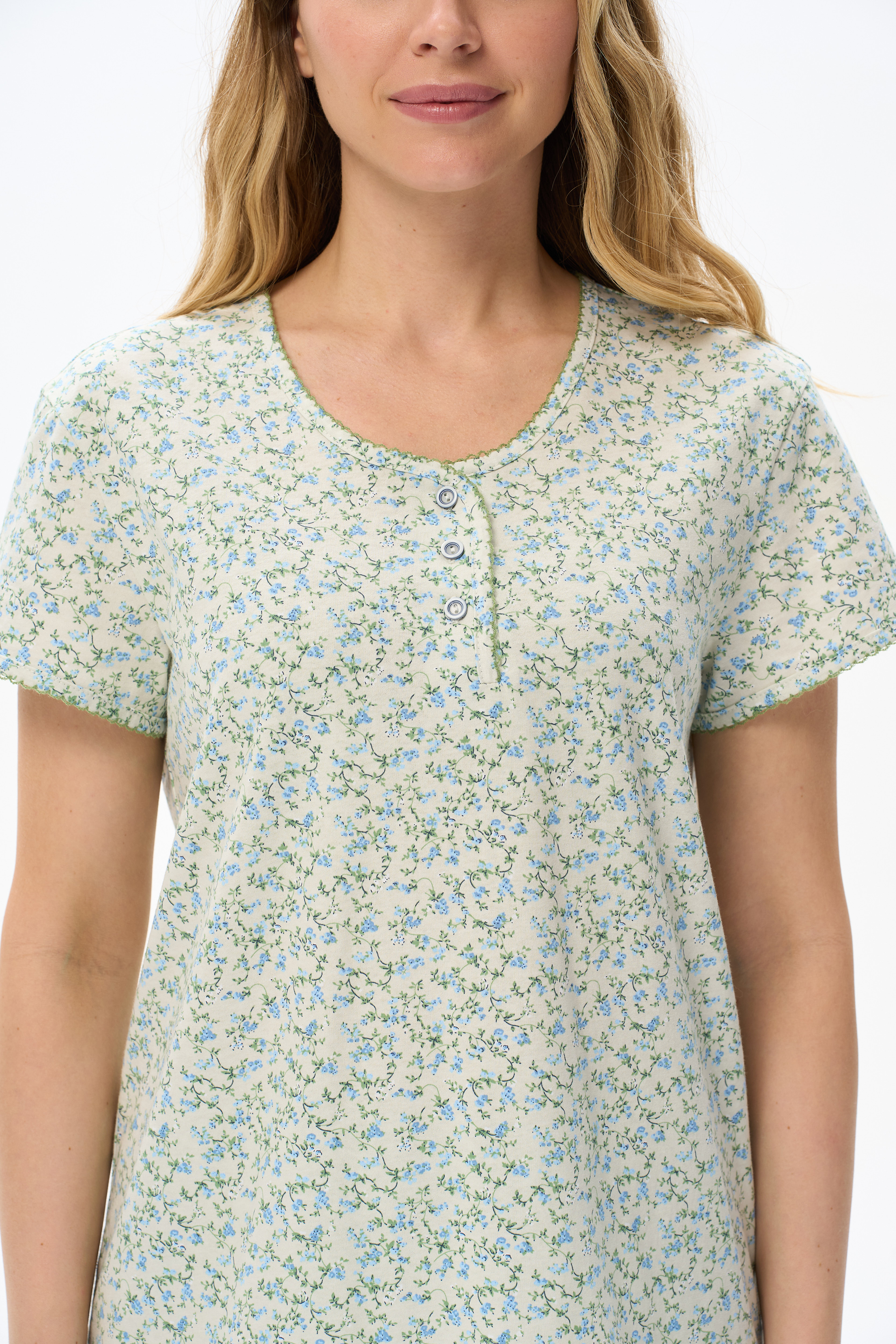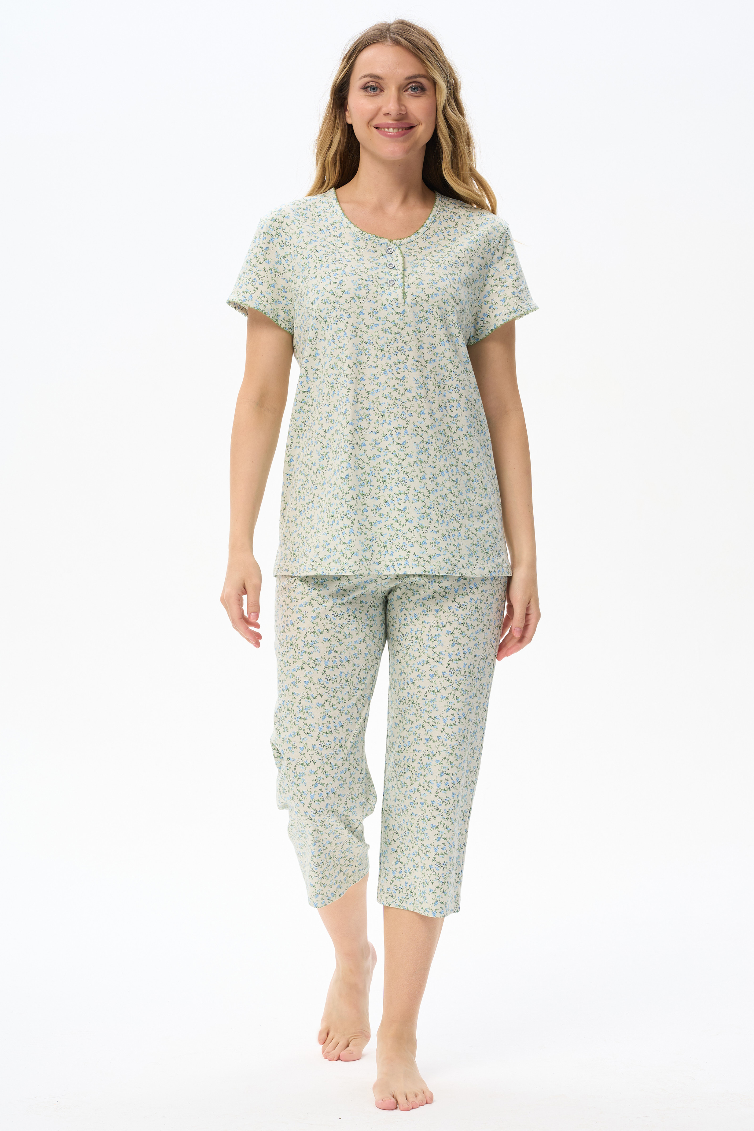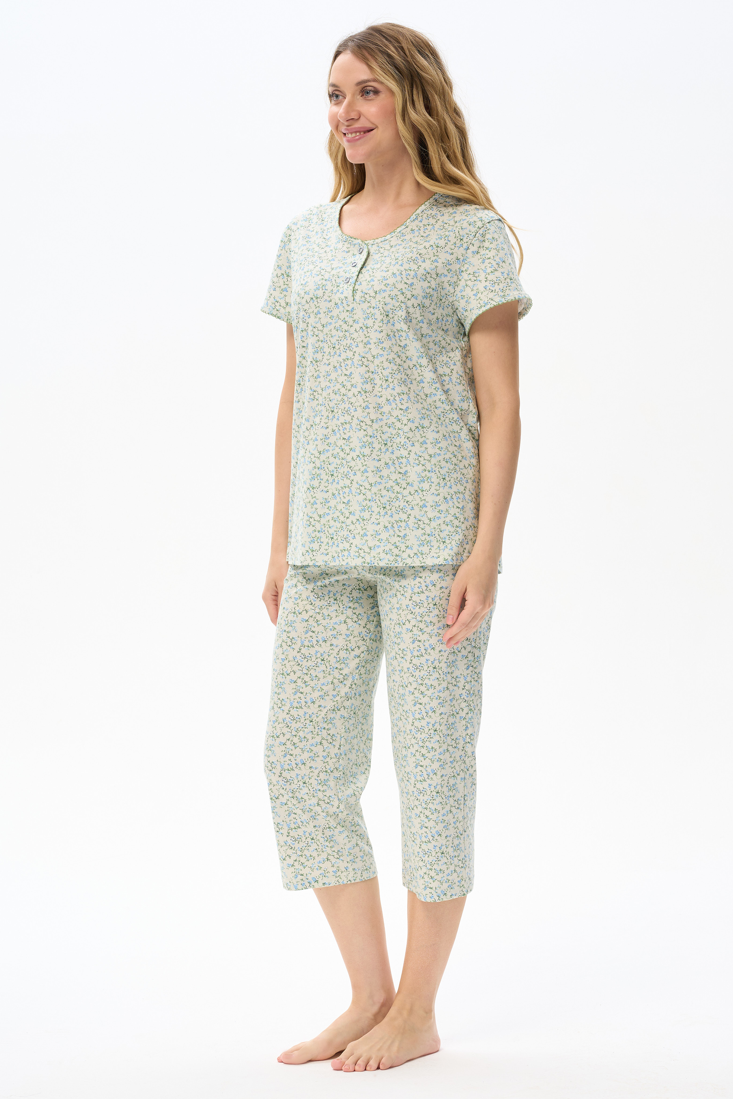 100% хлопок Пижама из хлопкового полотна. Верх свободного силуэта, круглый вырез горловины с застежкой на пуговицы, втачные короткие рукава. Вырез горловины и низ рукавов декорированы фестонами контрастного цвета. Прямые бриджи, пояс на резинке. Рост модели на фото 175см
