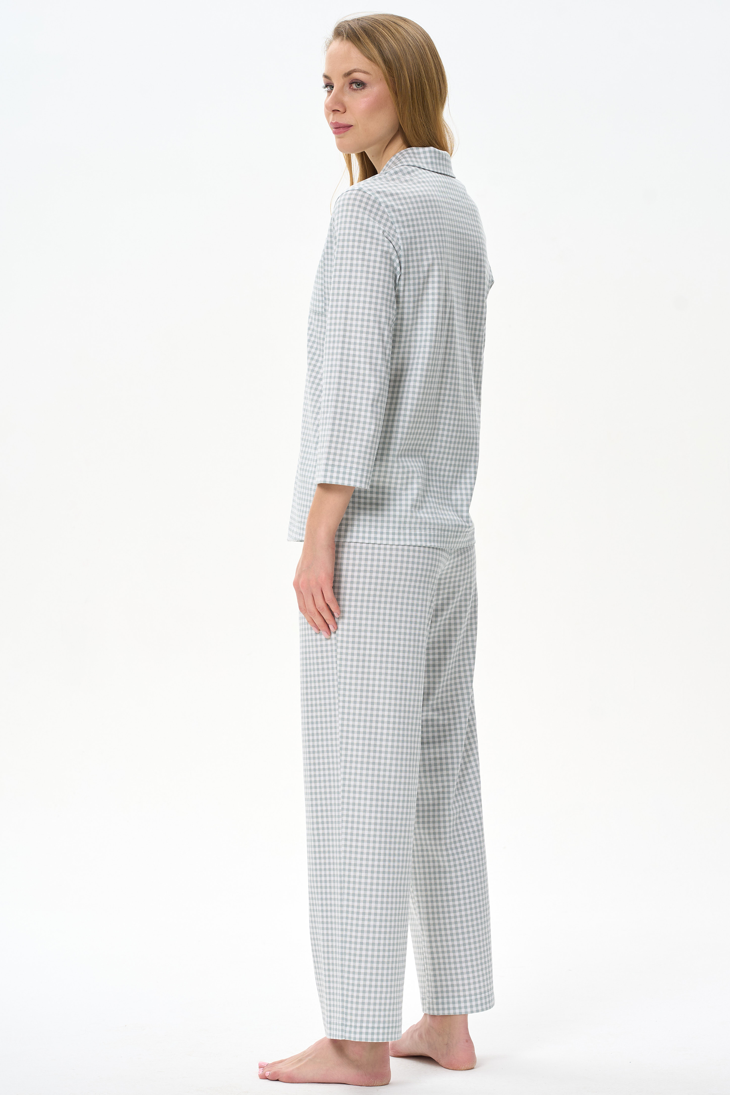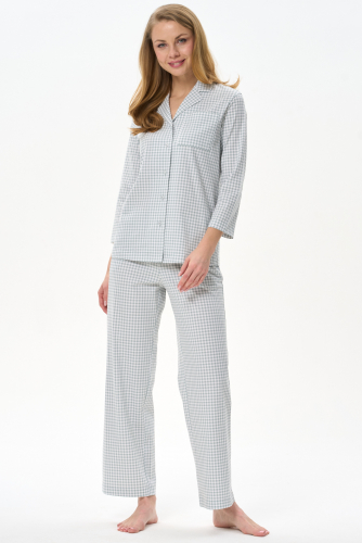 100% хлопок Пижама из хлопкового трикотажного полотна. У рубашки отложной воротник с лацканами, центральная застежка на пуговицы, накладной карман. Втачные рукава с манжетами. Прямые брюки с карманами, пояс с эластичной тесьмой внутри. По низу брюк манжеты. Рост модели на фото 178см.