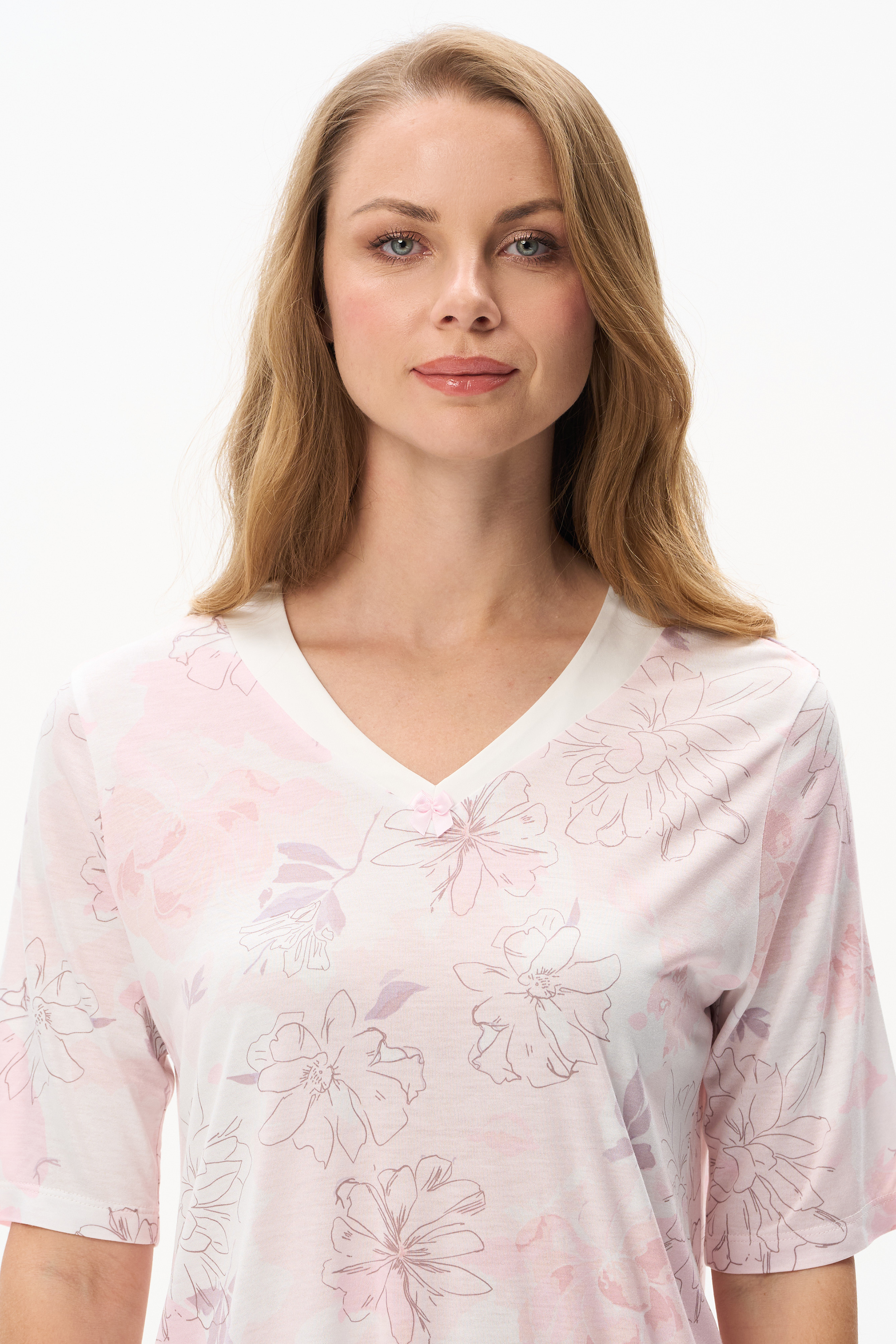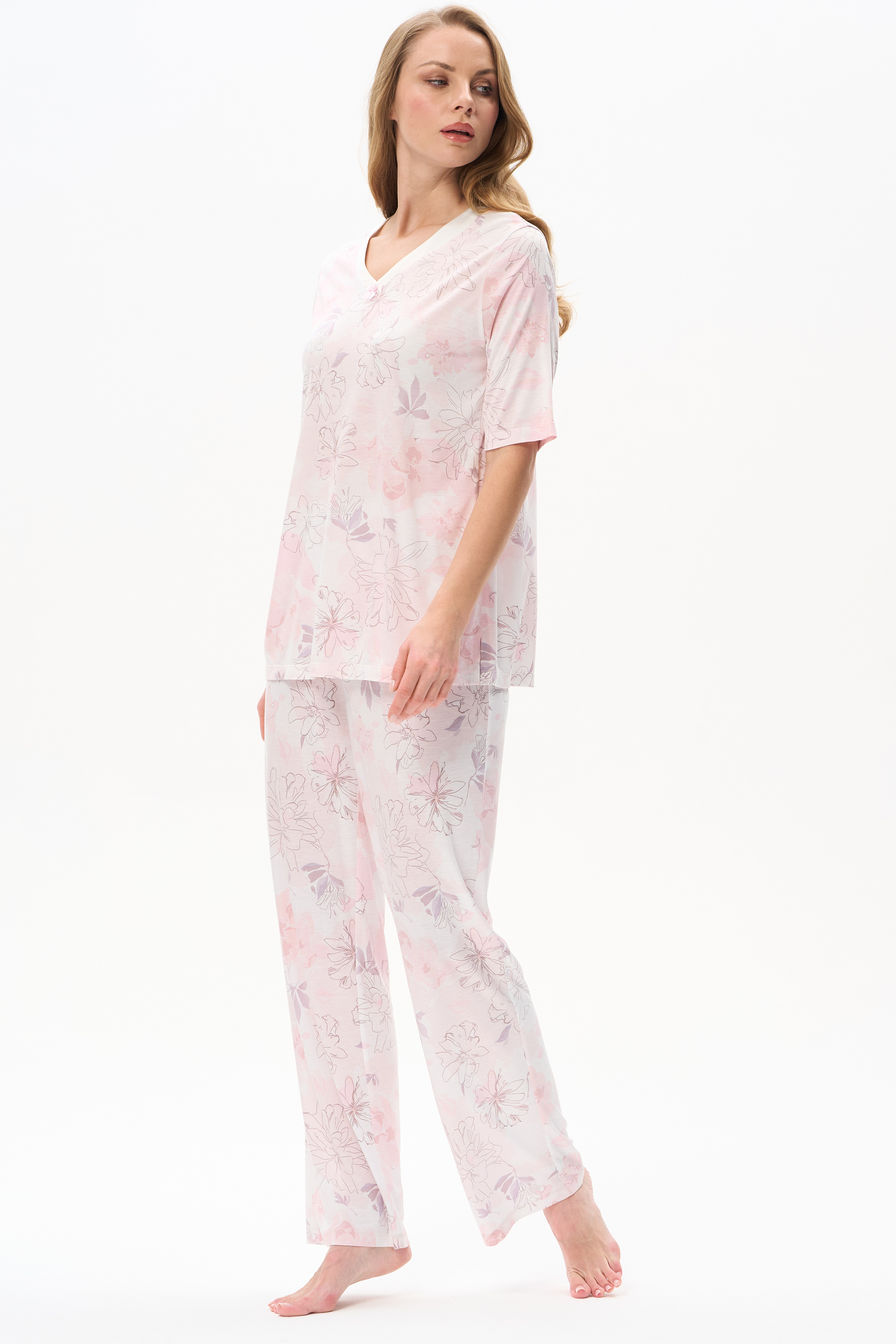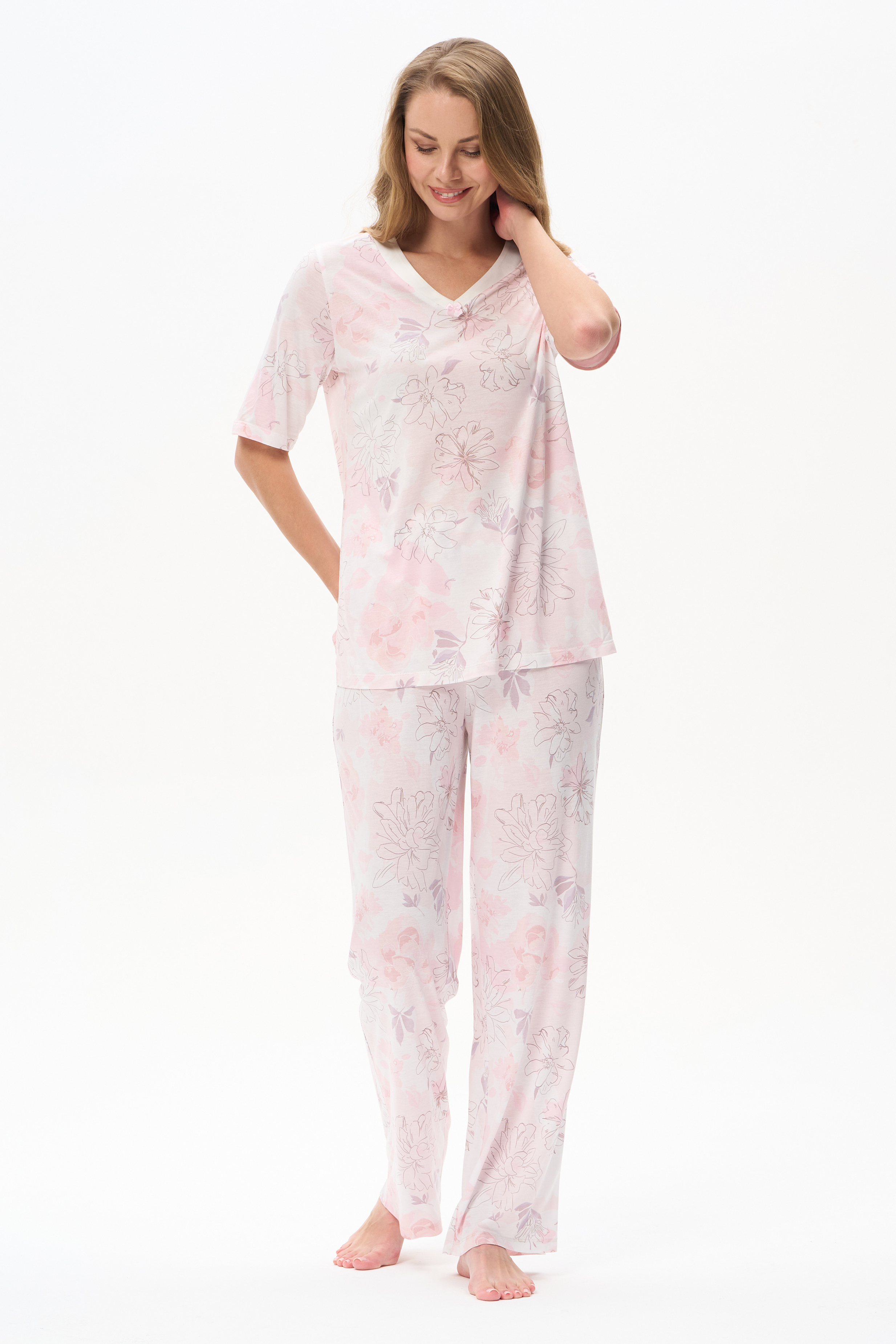 100% вискоза Пижама из вискозы качества вортекс мягкая, шелковистая, 160 гр. Дизайнерский рисунок в стиле LORY - Акварельный цветочный принт с тонкими изящными линиями в нежных розовых тонах и оттенке мокко. Блуза свободного кроя, удлинённая, рукава до локтя, V-образный вырез с атласной отделкой и бантиком добавляют эксклюзивности и утончённости модели. Брюки длинные свободные с мягкой резинкой по талии. Модель отлично подходит для сна и уютных вечеров. Рост модели 175 см