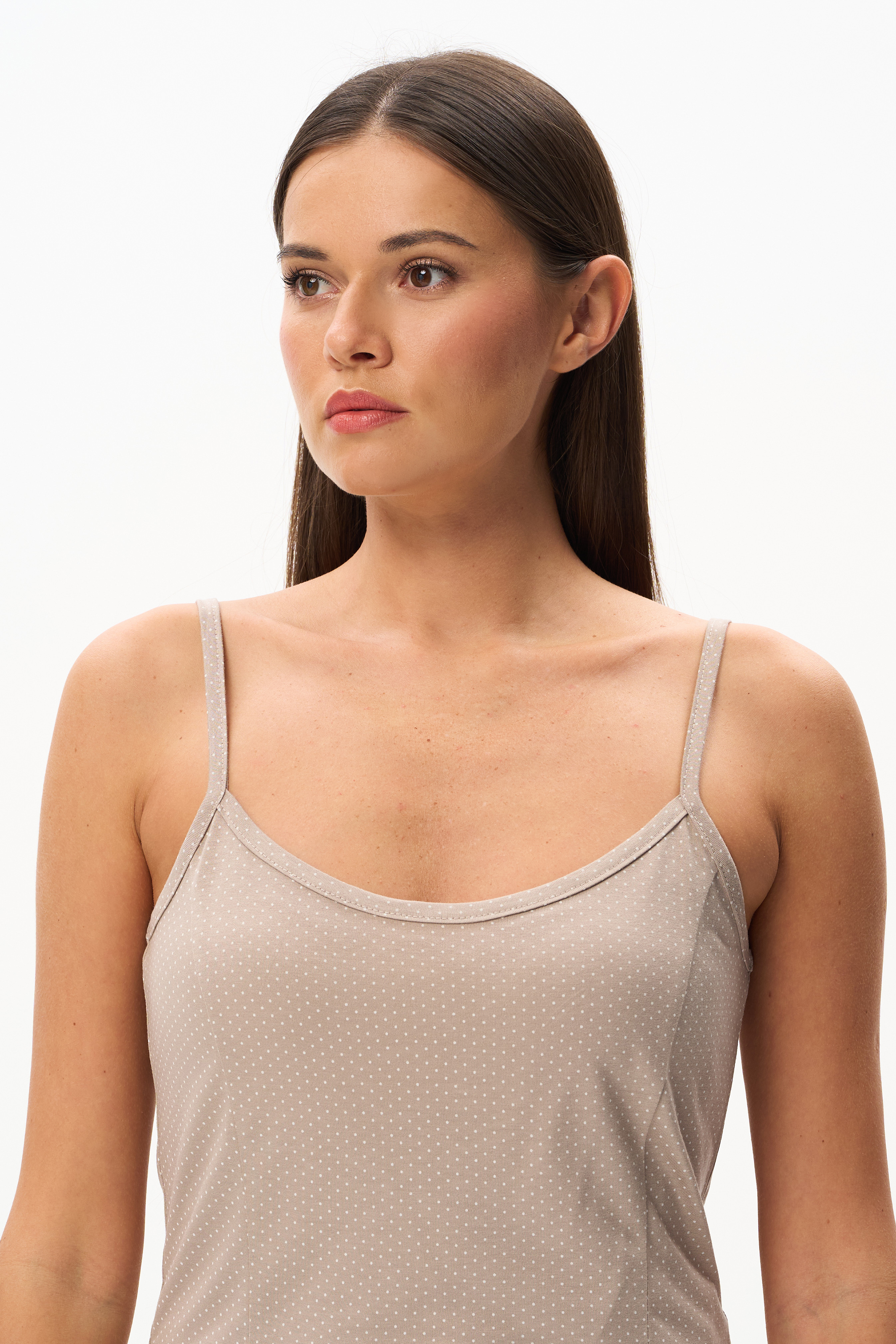 100% вискоза Пижама из мягкого, шелковистого вискозного полотна 160 гр. Рисунок - тонкие, изящные молочные точки на фоне мокко. Майка с рельефами на тонких бретелях. Шорты свободные с мягкой резинкой по талии. Отделка по краям придаёт утончённость модели. Удобная пижама для любого возраста. Рост модели 175 см