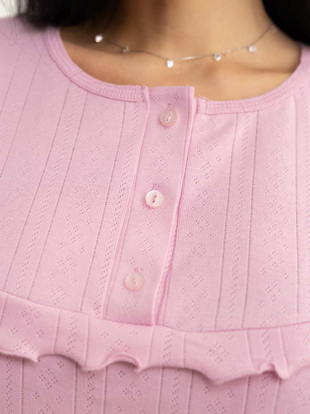 Пижама женская с шортами. Футболка с коротким втачным рукавом с обработкой края - волан и овальной горловиной с застежкой на пуговицы. На полочке отделка в виде тесьмы. Короткие шорты с поясом на резинке, для более удобной посадки, низ брючин так же имеет отделку - волан.