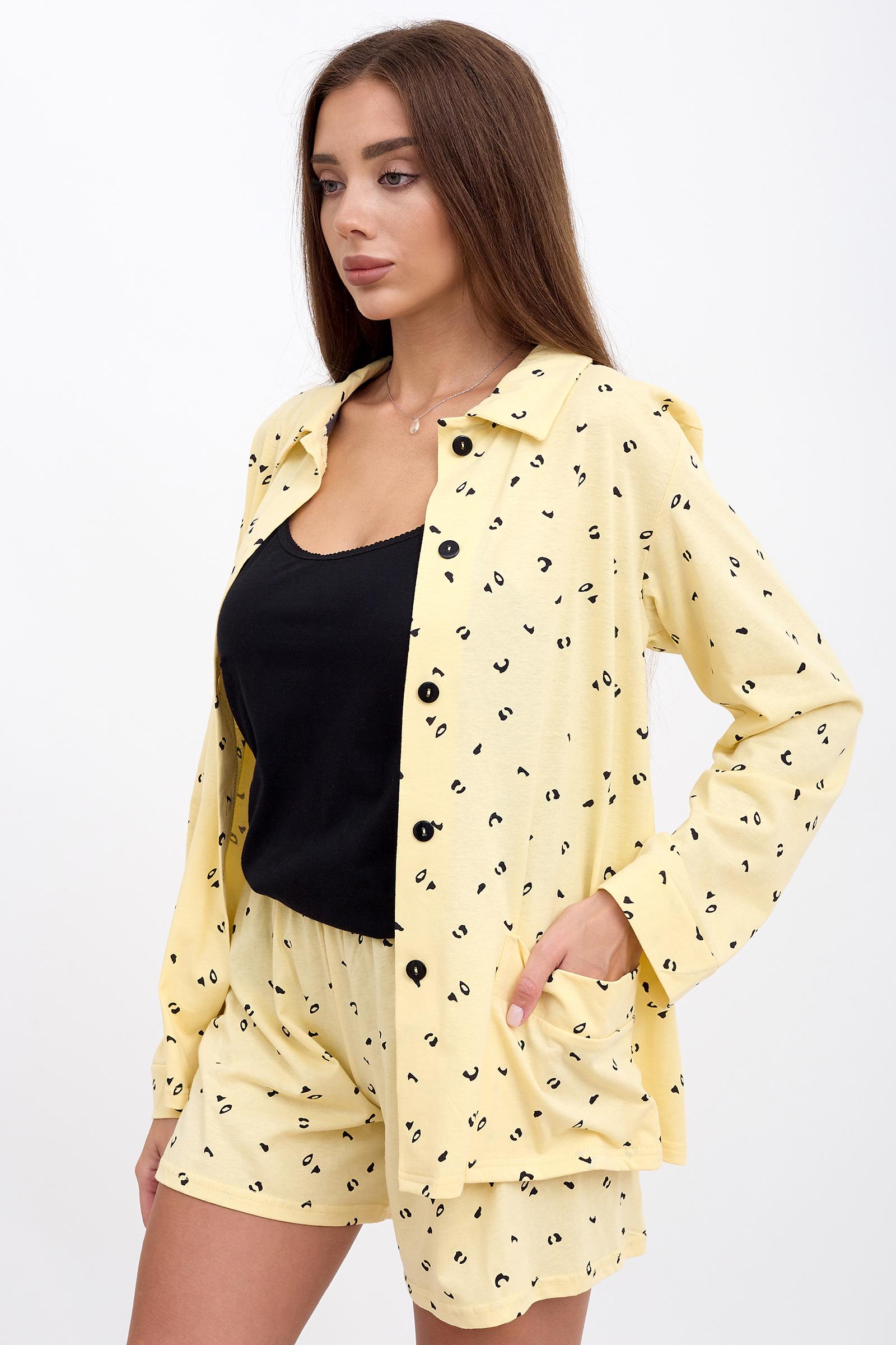 Универсальная женская пижама для отдыха и сна. Комплект тройка состоит из рубашки на пуговицах с карманами, черной майки и удобных шорт. В такой пижаме удобно ходить дома и заниматься домашними делами или просто отдыхать. Пижама может стать отличным подарком на любой праздник.