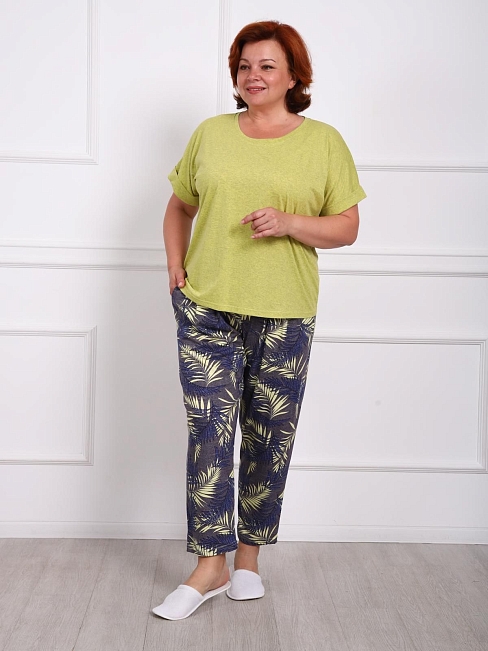 Костюм выполнен из ткани кулирка 100% хлопок. Футболка со спущенным рукавом с манжетой. Горловина обтачка. Бриджи с карманами и кокеткой. Пояс с резинкой 3 см. Под кокеткой складки.
