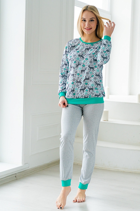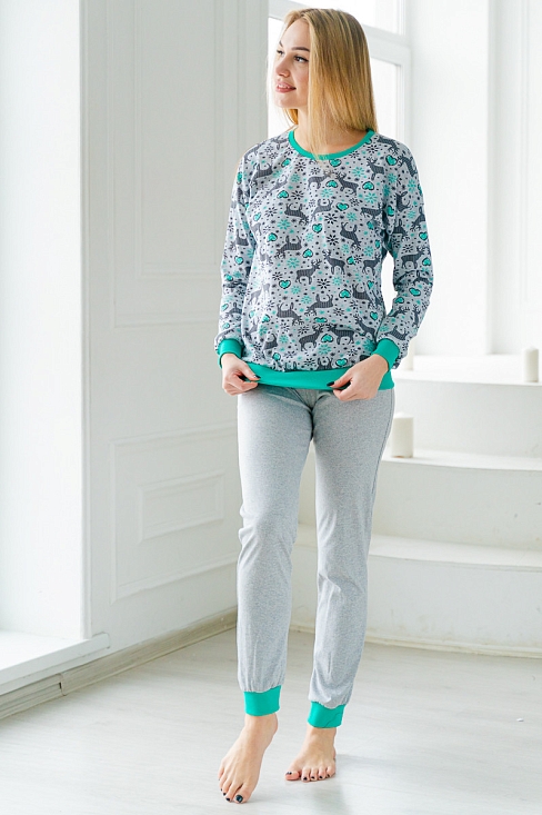 Пижама женская из джемпера и брюк из кулирки Олененок / Ментол из трикотажного 100% хлопка. Уютная домашняя одежда состоит из кофты с длинным рукавом и брюк. Штаны на резинке, толстовка прямого кроя.
