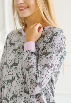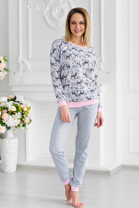 Пижама женская из джемпера и брюк из кулирки Олененок розовый из трикотажного 100% хлопка. Уютная домашняя одежда состоит из кофты с длинным рукавом и брюк. Штаны на резинке, толстовка прямого кроя.
