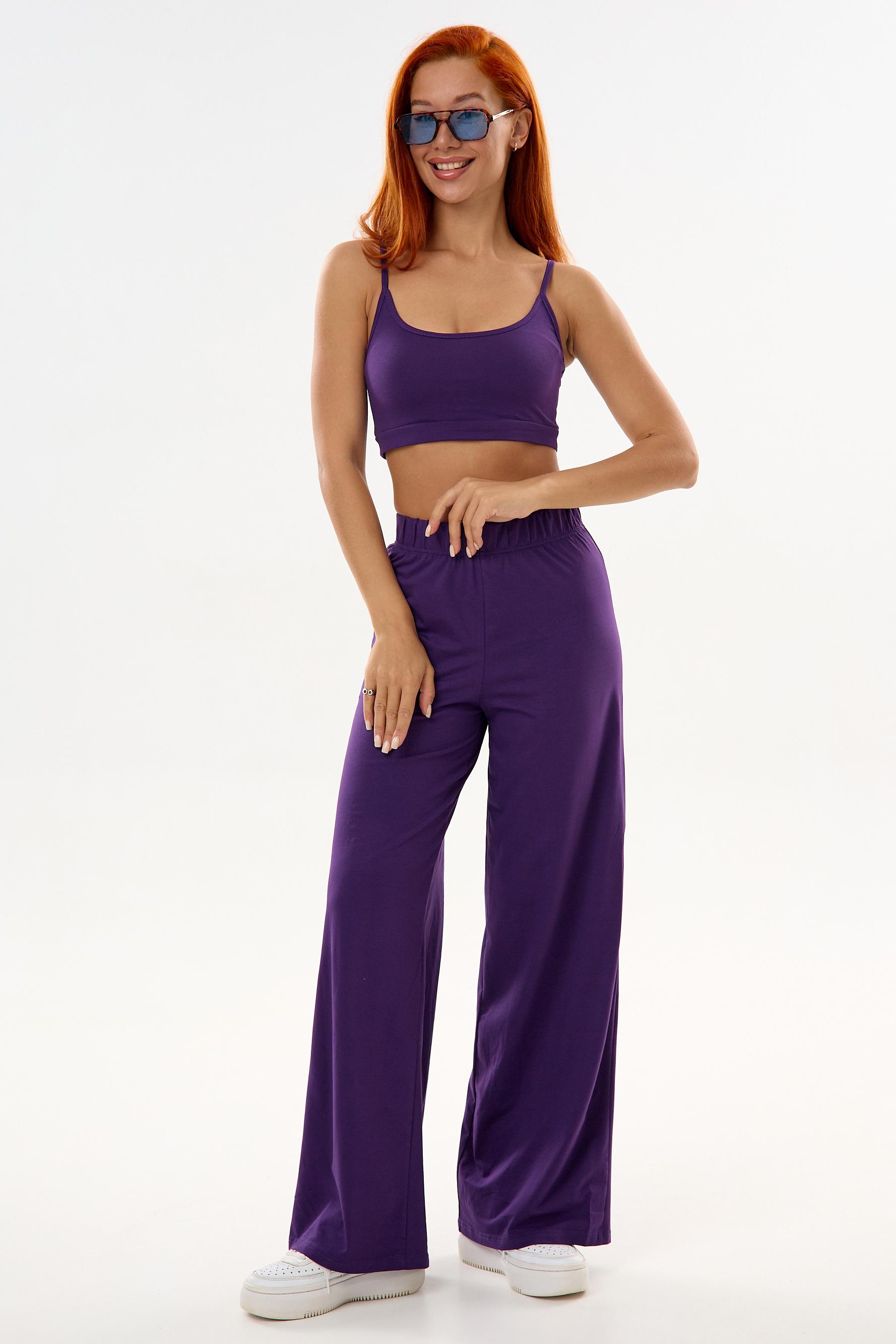 Пижама женская Колибри Ф Арт. 10443 / Фиолетовый отшивается из хлопковой ткани с добавлением лайкры. Женский костюм состоит из укороченного топа на тонких бретелях и свободных пижамных брюк.