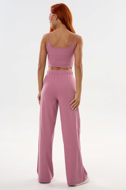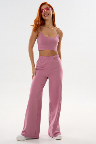 Пижама женская Колибри Р Арт. 10439 / Розовый отшивается из хлопковой ткани с добавлением лайкры. Женский костюм состоит из укороченного топа на тонких бретелях и свободных пижамных брюк.