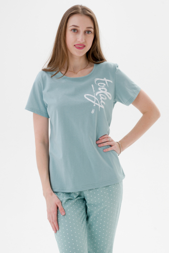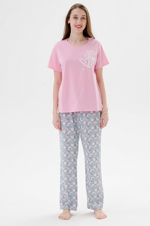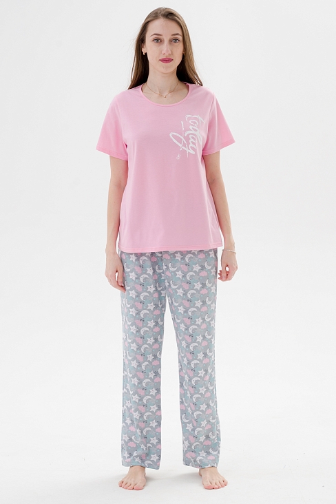 Нежная женская пижама с футболкой с коротким рукавом и удобными брюками — воплощение домашнего комфорта и стиля, создающее атмосферу уюта и расслабленности. Мягкая ткань приятно облегает тело, позволяя коже дышать, а элегантный дизайн делает его идеальным выбором для спокойного сна и отдыха.