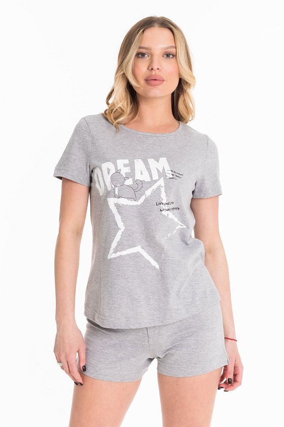 Комплект домашний выполнен из кулирки, состоит из футболки и шорт. Футболка с втачным рукавом, горловиной с круглым вырезом. Спереди нанесён принт. Шорты короткие, с притачным поясом, посередине имитация застежки на пуговицу.