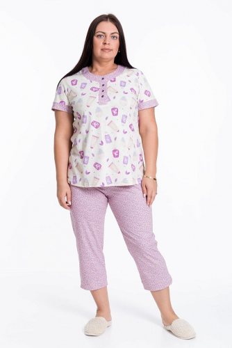 Пижама выполнена из кулирки, 100% хлопок. Футболка с принтом и коротким рукавом на манжете. Горловина с V-образным вырезом на полочке и спинке. Бриджи с поясом на резинке, с карманами по бокам.