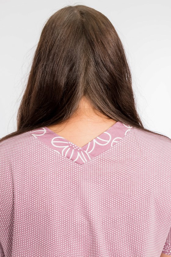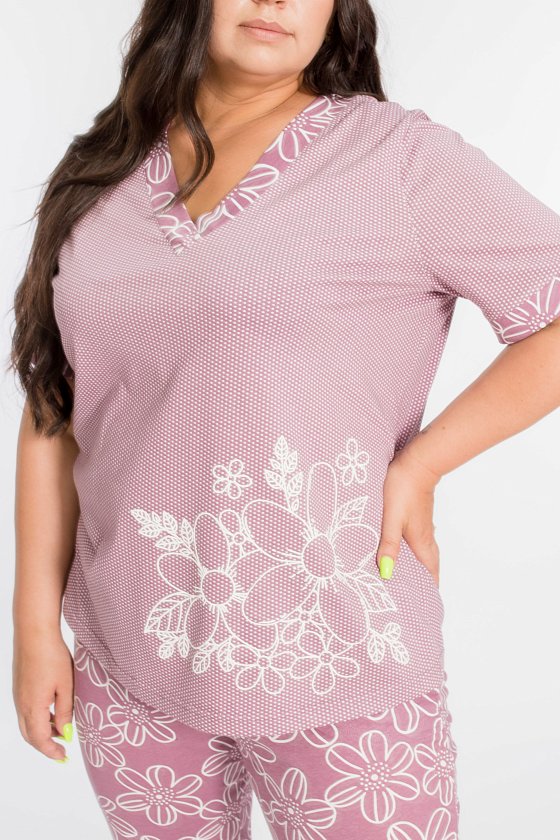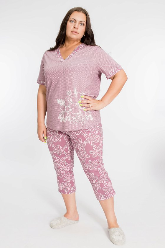 Пижама выполнена из кулирки, 100% хлопок. Футболка с принтом и коротким рукавом на манжете. Горловина с V-образным вырезом на полочке и спинке. Бриджи с поясом на резинке, с карманами по бокам.