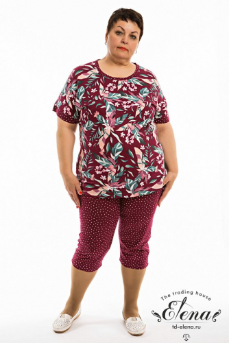 Женский костюм выполнен из хлопкового полотна, состоит из футболки и капри. Футболка однотонная, круглый вырез горловины и низ рукавов отделаны бейкой из контрастного по цвету полотна. Капри из полотна с набивкой, пояс на резинке.